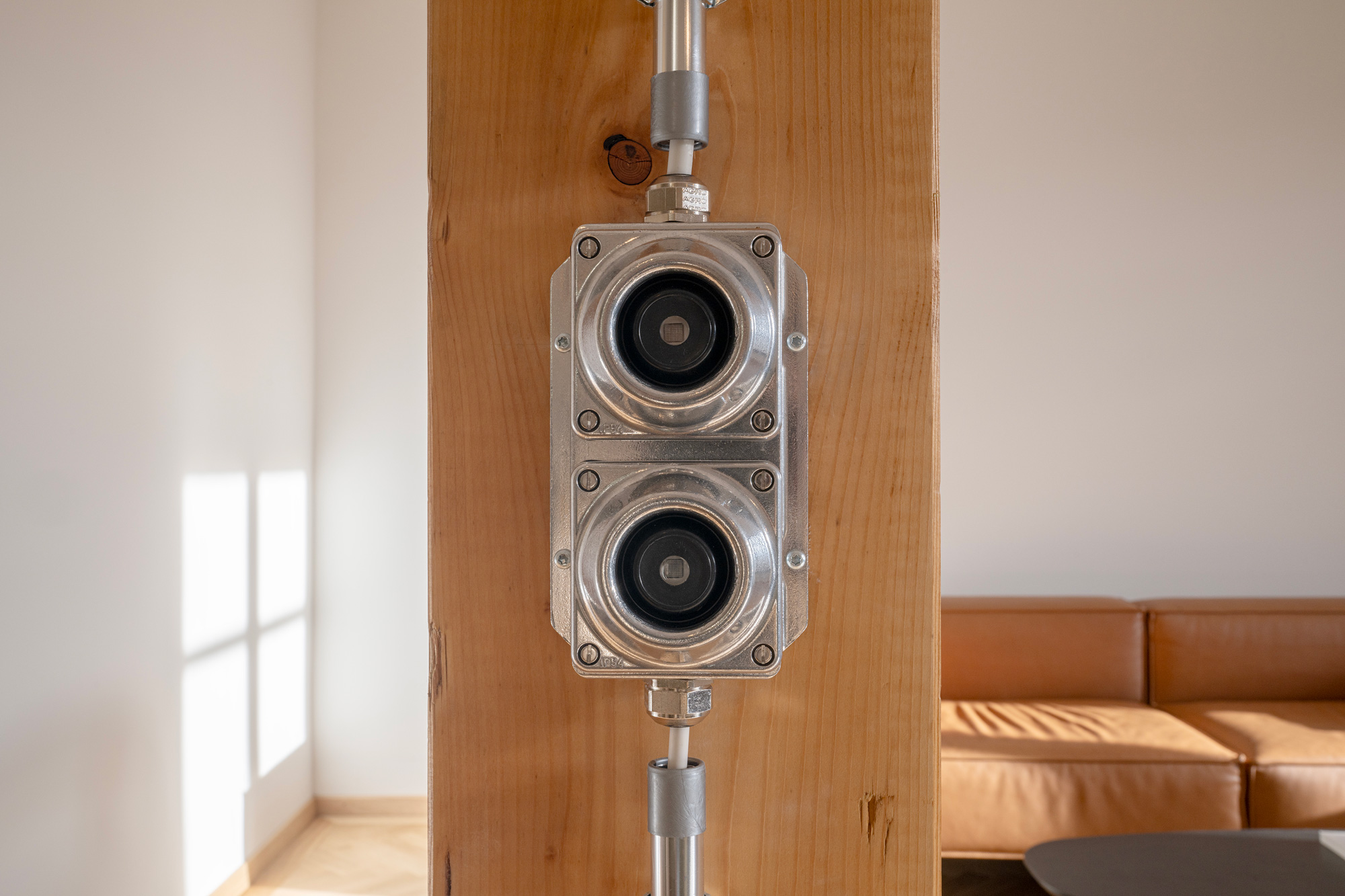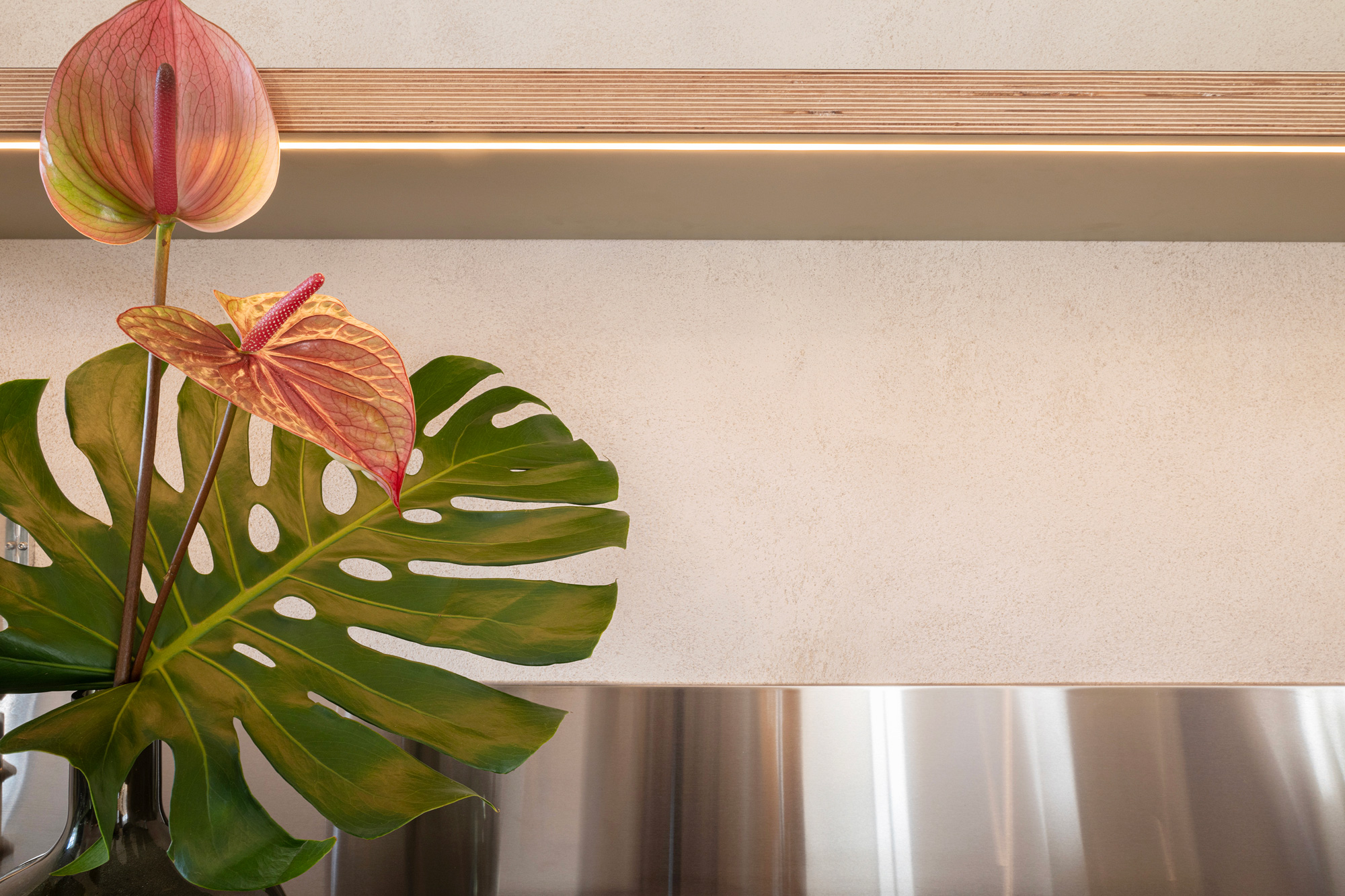 Une cuisine réalisée sur mesure vient définir l’espace. Des suspensions installées sur un rail permettent de positionner la lumière en fonction de l’usage. L’ajout d’éléments électriques est assumé et mis en valeur avec les tubes en inox et l’appareillage apparent.